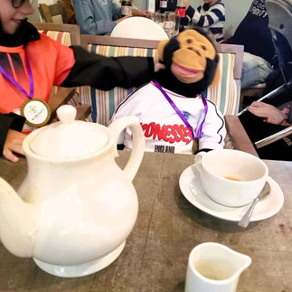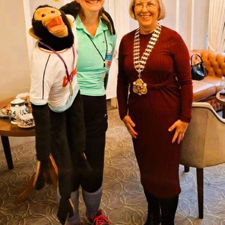 Cheeky Monkey warmed up with a hot cocoa with the Mayor of Barnstaple no less! He is ready in the Pink Hall to show off his football strip this week!